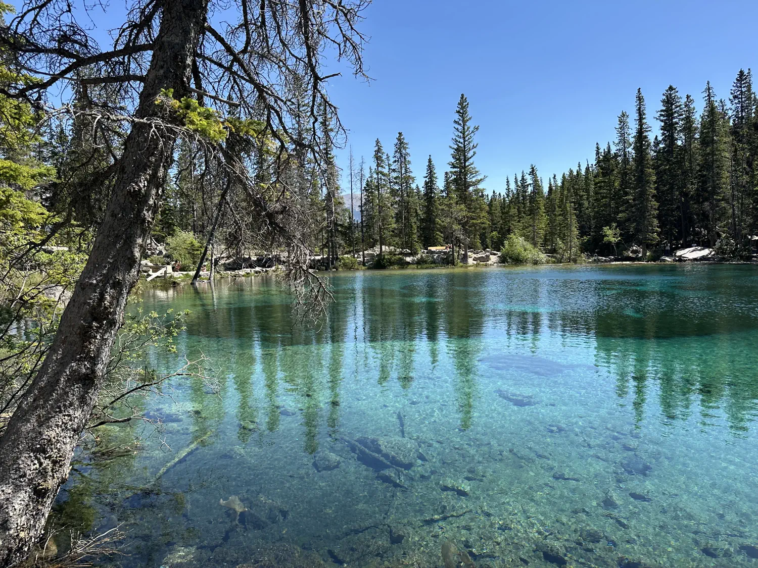 Keith planned a training ride to the nearby town of Canmore, so I chose the hike to Upper Grassi Lakes in hopes that we’d be able to meet up in town that afternoon. The Upper Grassi Lakes hike was perfect for me since I hadn’t hiked much, if at all, this year. I tracked just over 2 miles (3.2 kilometers) and almost 600 feet (182 meters) of elevation gain. I took the more difficult way up and the easier route down. This allowed me to see both sides of the trail and challenge myself a bit with the steeper uphill. I worked on a steady pace with little to no stopping and was rewarded with one of the most amazing mountain lakes I’ve ever seen! The water was an amazing color, and I loved the pine trees surrounding the lake. Walking around the area had so many spots to take photos. It was super enjoyable to explore every little nook and cranny. It was a little busy, but with so many places to sit and enjoy the numerous views, it didn’t feel too crowded. I didn’t want to leave and found myself a seat in several different locations just to enjoy my time in nature.