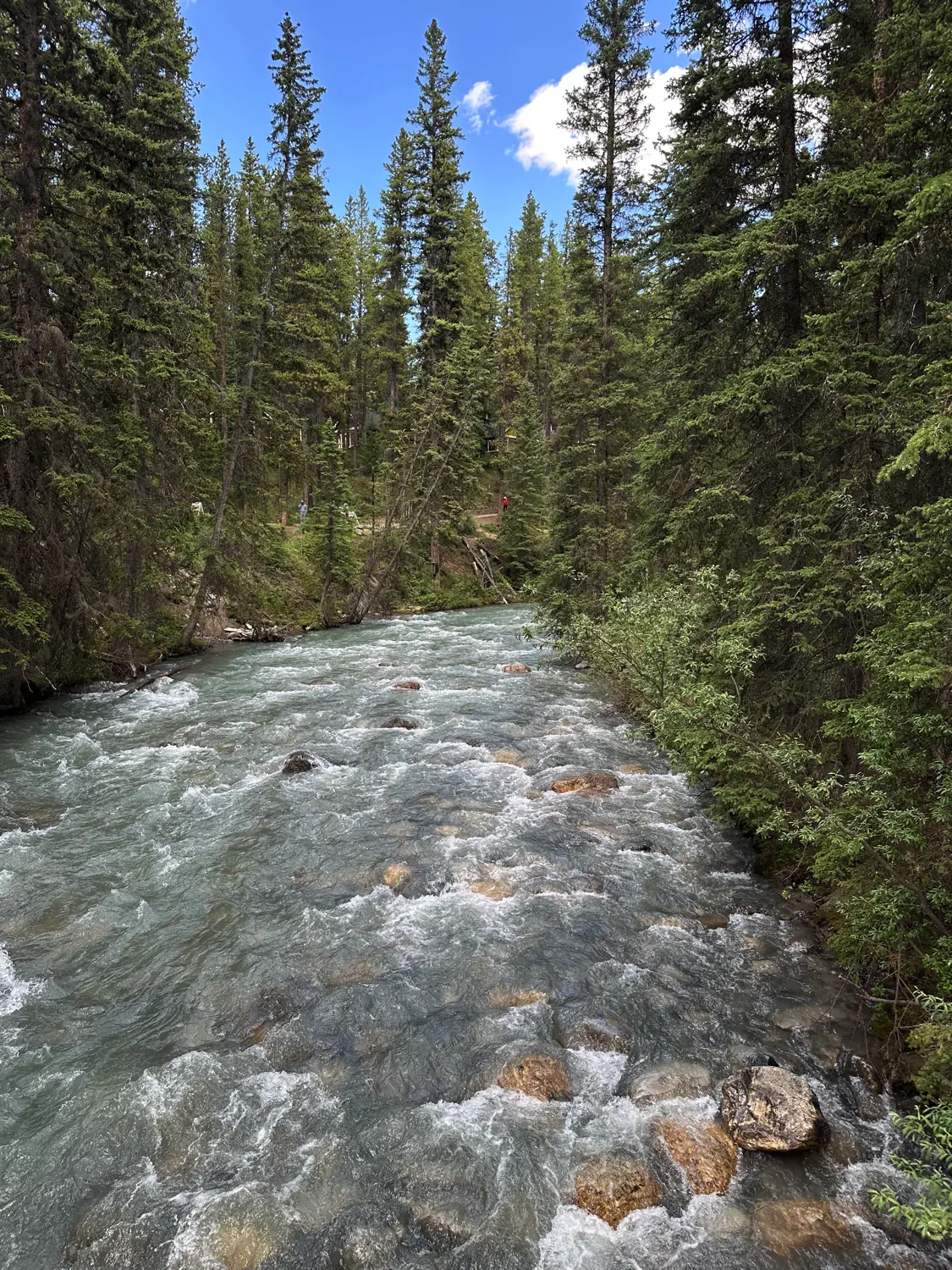 In the afternoon, we visited Johnston Canyon together. I guess we did do a couple of the popular activities in Banff! Johnston Canyon is known for its iconic suspended catwalks and waterfalls. Meandering along the catwalks was such a good experience. The rush of water below you drowned out the noise from the numerous other guests, which helped to lessen the crowded feeling of this attraction. We took our time enjoying as much as we could of the canyon and waterfalls. We did the Johnston Canyon Upper Falls Trail, 3.4 miles (5.4 kilometers) with about 900 feet (274 meters) of elevation gain.
