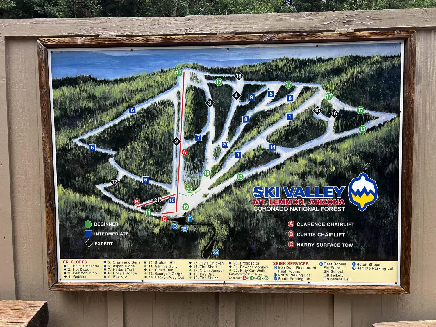 Another great memory from our time in the area is driving Mount Lemmon. The scenic drive blew us away at every mile! The views were incredible, and the finale was the small idyllic town of Summerhaven. On the way to the top, we stopped at Ski Valley to ride the ski lift and check out this tiny resort. The resort has one two-person ski lift and two surface lifts to access its 21 ski runs. We felt like we were stepping back in time, and everything seemed so small, but the cutest!