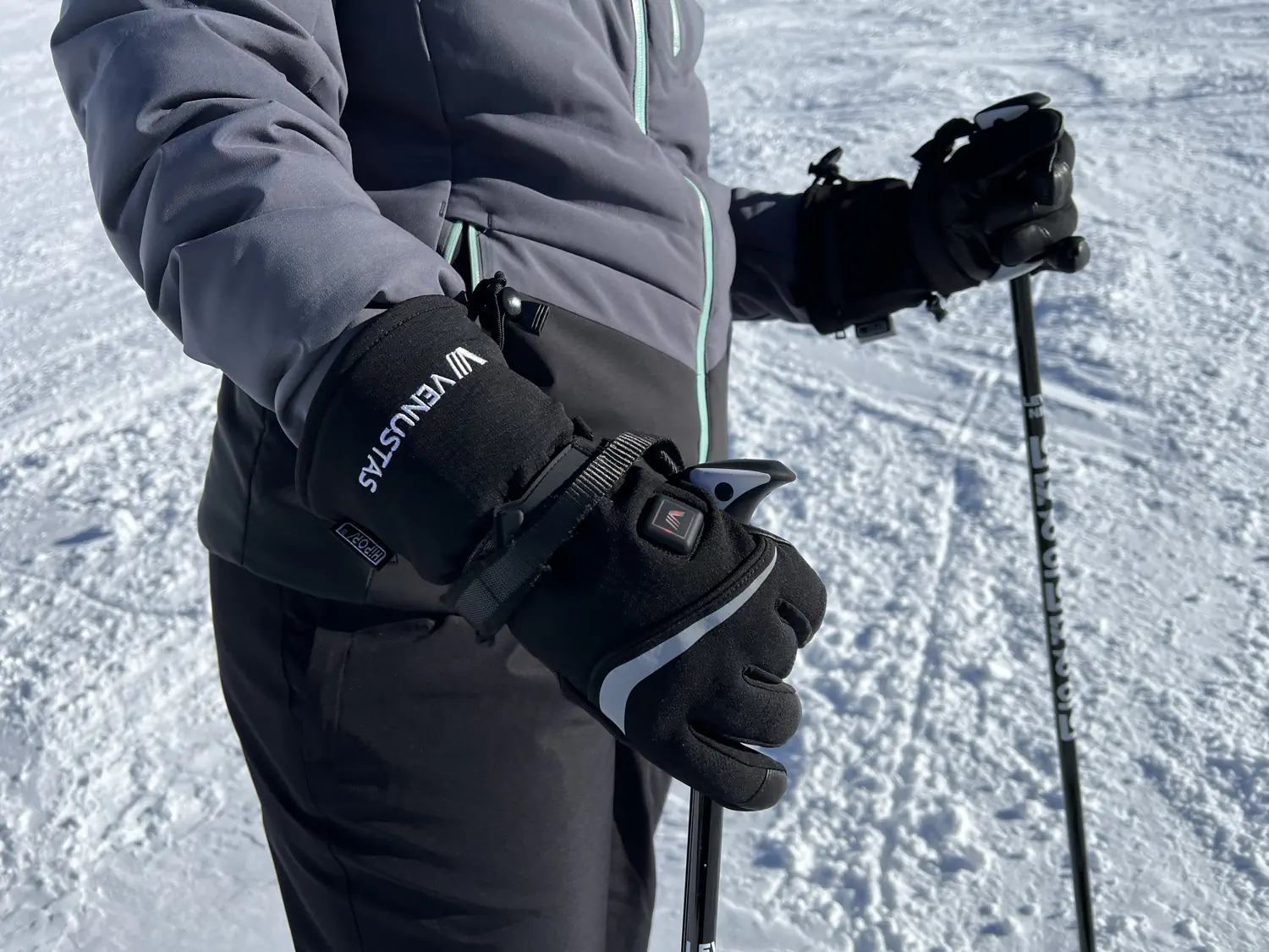 Gallery of Lindsey wearing the Venustas heated gloves while skiing