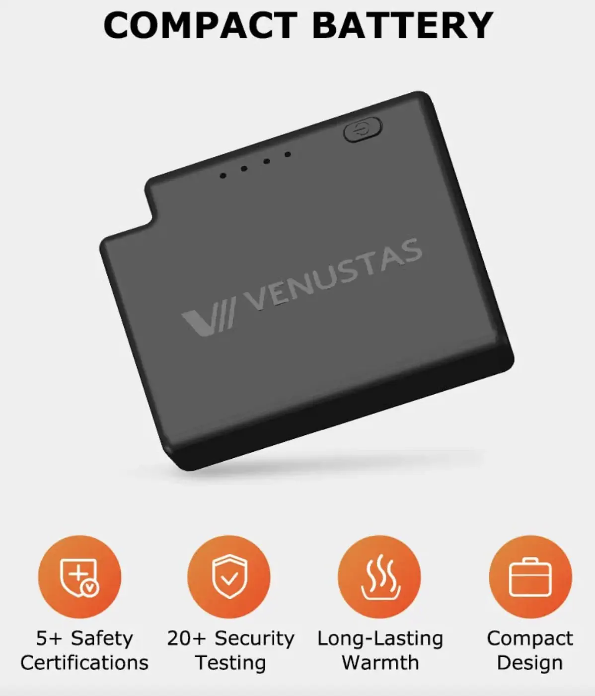 - First would be the battery size. This, of course, is expected, and as battery technology improves, this could be a change in the future. I'm sure this company is choosing an option based on performance, size, etc. Below, I will also address this compared to the size of a handheld warmer. Spoiler: the VENUSTAS battery is way smaller!