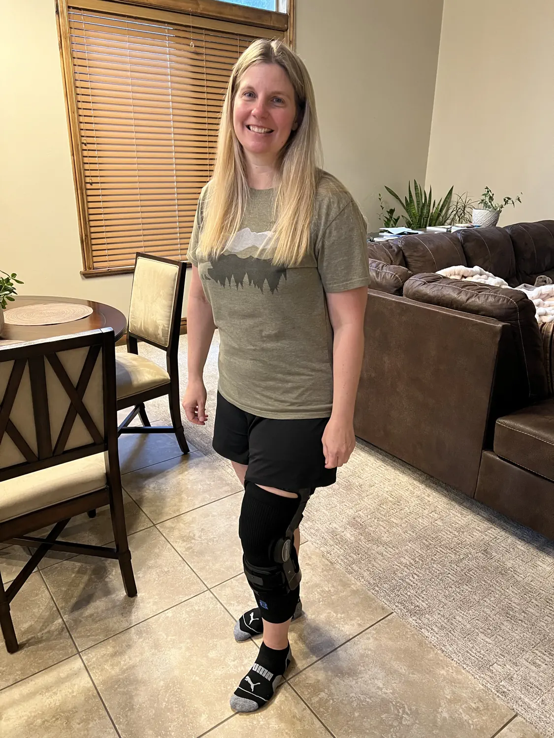 Lindsey recently had a Platelet Rich Plasma (PRP) injection in her left knee to help repair a small tear in her distal biceps femoris / lateral collateral ligament (LCL). Dr. Chappell recommended that Lindsey use a functional brace as a post-op recovery tool.