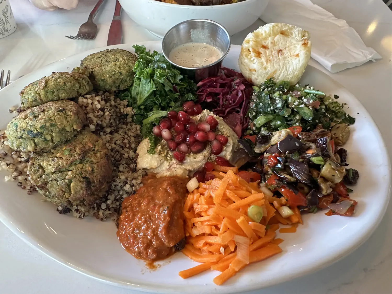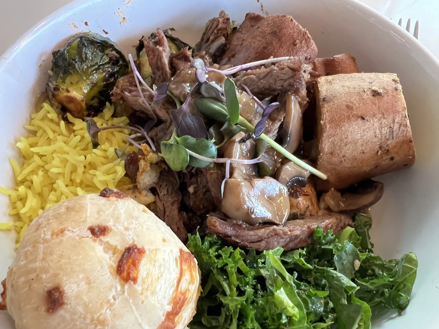 Lindsey ordered the Mediterranean Plate with falafel. Keith ordered the Tri-Tip Madeira Bowl with tri-tip steak. Both meals were beautifully presented and just as delicious as they looked. π This meal was exactly what we were hoping for in terms of not being overly-heavy yet still amazingly delicious.