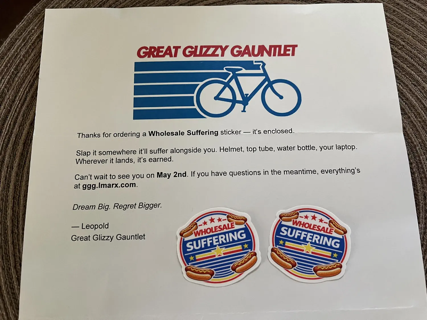 Gallery of Keith's race plans for the 2026 Great Glizzy Gauntlet, and the "Wholesale Suffering" π€£ stickers he ordered