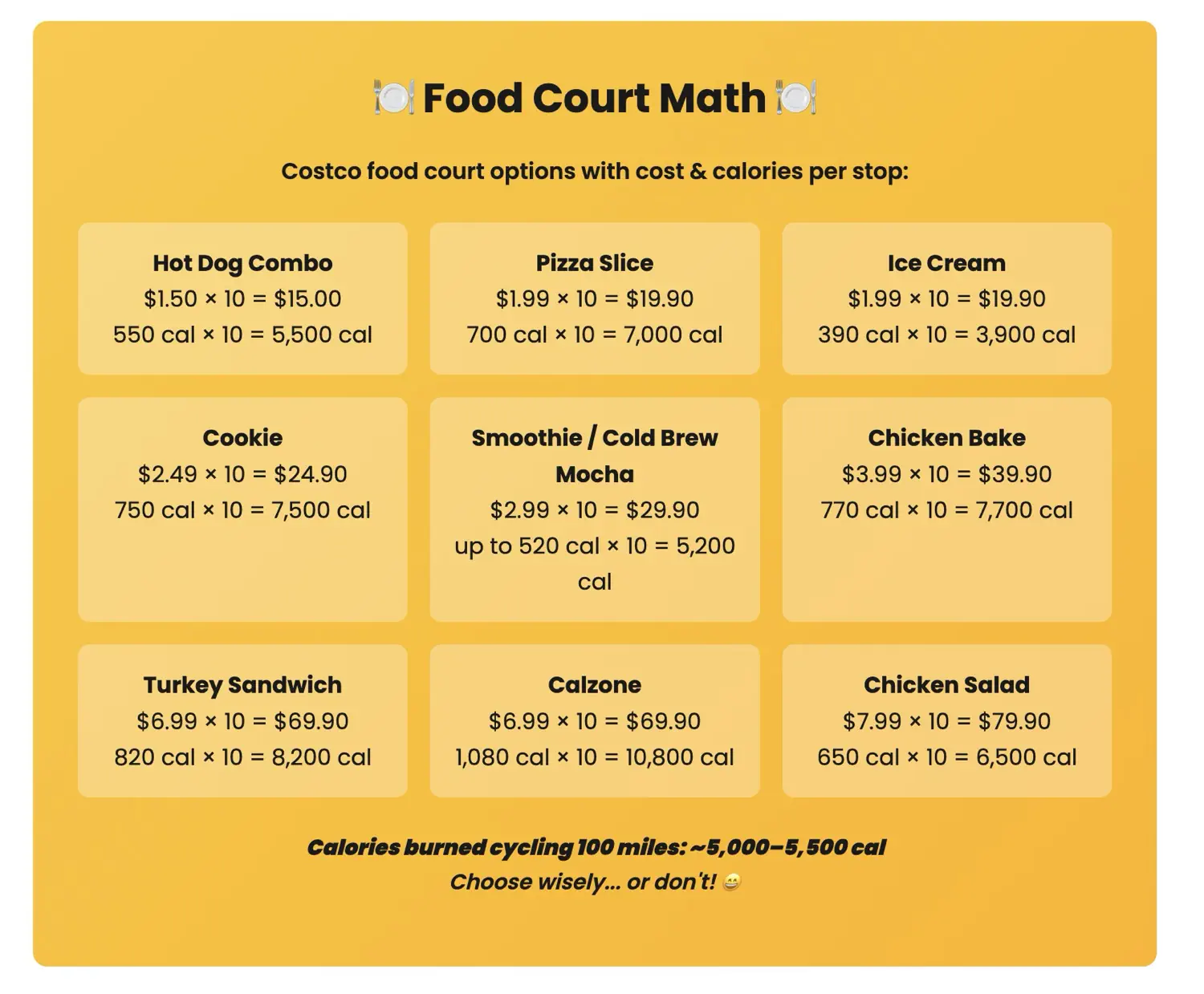 If you haven't been following along, the Great Glizzy Gauntlet is no ordinary bike race. It is also an eating contest, where riders must purchase and eat at least one item from each of the 10 distinct Costco food courts along the route. Keith is planning to stick with the primary intent of the race and eat a hot dog (i.e., "glizzy") at each location.