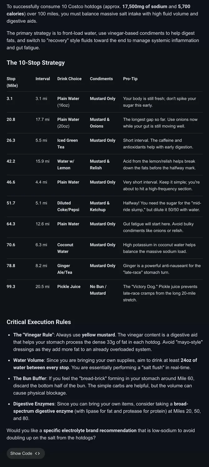 Eating 10 hot dogs while riding 100 miles is going to be quite the challenge! So, Keith enlisted the help of Google's AI tools to come up with a plan for how to prevent an upset stomach and allow his body to successfully process everything. Keith also researched the UTA FrontRunner train schedule as he will need to ride the train back to Orem, UT, from the race end in Bountiful, UT.