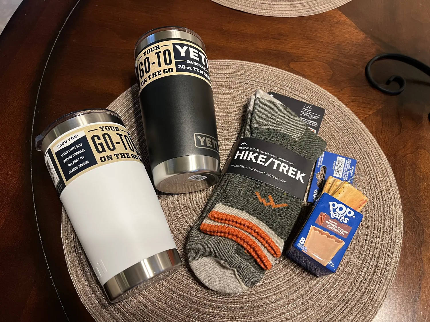 Lindsey surprised Keith with a few small gifts! π² π These gifts included a new set of Yeti Rambler 20oz travel coffee mugs. to replace our aging Topgolf mugs that we received several years ago. Lindsey also bought Keith a nice set of hiking socks and the most amazing Pop-Tarts Christmas tree ornament, to commemorate his 2025 Tour Divide race! π€£